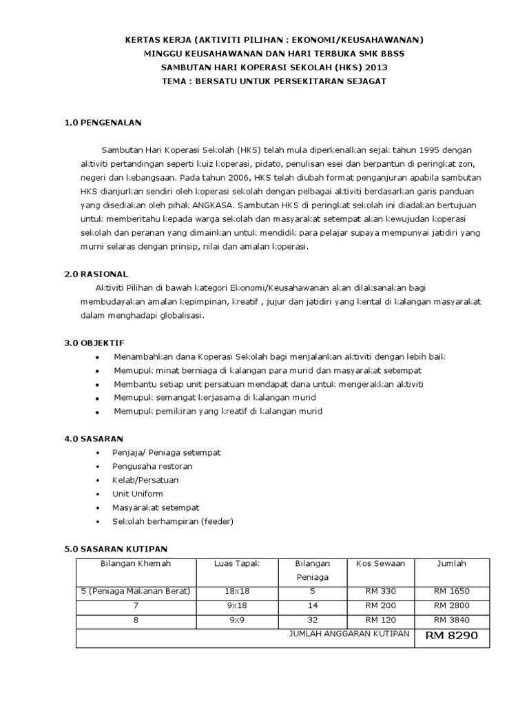 Text of contoh kertas kerja rancangan perniagaan koperasi. KERTAS KERJA NAMA PROGRAM Bahasa Melayu sahaja TARIKH haribulantahun TEMPAT bangunankawasandaerah ANJURAN nama sekretariat penganjur DENGAN. 3Mengedarkan borang penyertaan gerai kepada semua guru penasihat kelab.